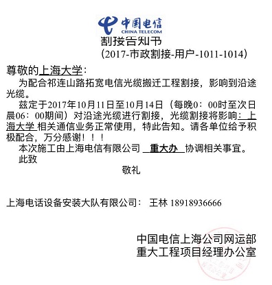 接中国电信光缆割接通知,兹定于2017年10月11日至10月14日(每晚0:00时至次日晨06:00期间)对沿途光缆进行割接,光缆割接将影响国产亚洲精品美女久久久相关通信业务正常使用,届时将会对校园网络造成影响,特此告知!
