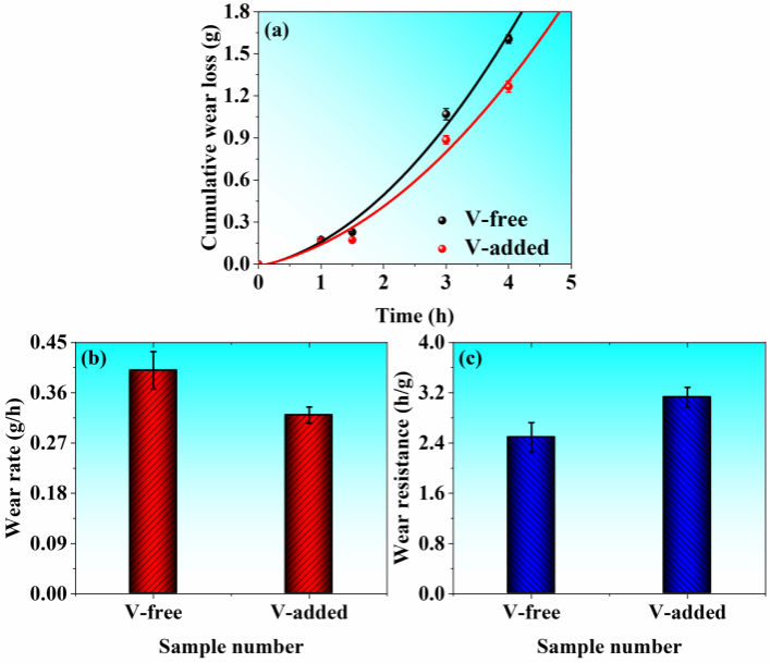 实验结果表明,随着V元素的添加,纳米析出相的数量密度从0.89×1012m-2增加到2.76×1012m-2,纳米析出相的平均尺寸由104 nm减小到92 nm,同时,屈服强度由1450 MPa提高到1630 MPa,耐磨性提高提高了25%以上。这主要是因为V元素促进了纳米析出相的形成,使得其在磨损过程中形成了更硬的加工硬化层,导致微犁、微切削和压痕的深度明显减小。本研究为V元素在中碳CrMo铸钢的应用提供了理论基础,为延长球磨机和半自磨机衬板的使用寿命提供了重要策略。