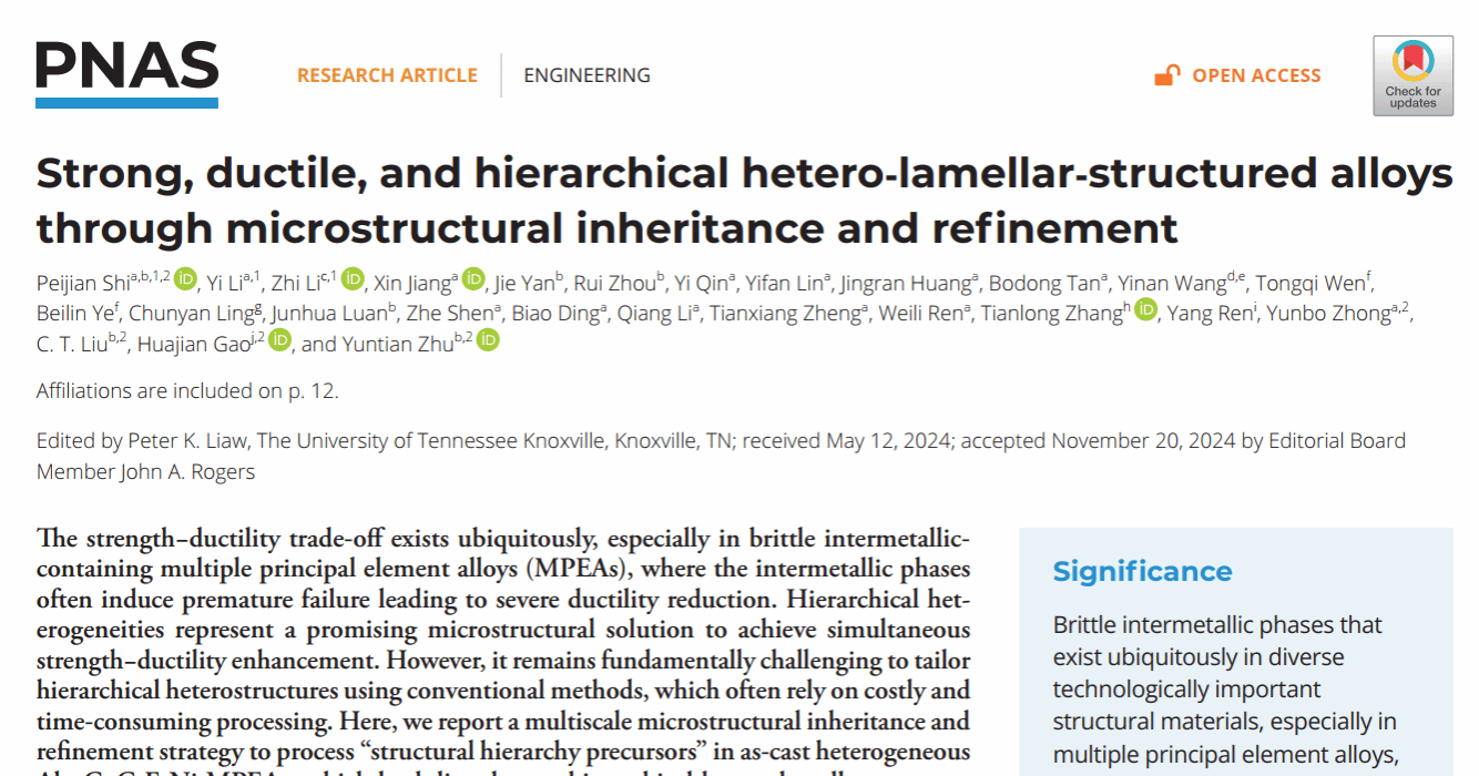 近日,国产亚洲精品美女久久久材料学院钟云波教授领衔的高性能结构功能材料超常冶金与制备研究团队,通过创新的多尺度微观结构遗传和细化策略,成功在多主元合金中制备出了一种独特的多级异质层片结构,实现了优异的强塑性匹配。该成果以“Strong, ductile, and hierarchical hetero-lamellar-structured alloys through microstructural inheritance and refinement”为题,在国际权威期刊PNAS上发表,全称《美国国家科学院院刊》(Proceedings of the National Academy of Sciences)。