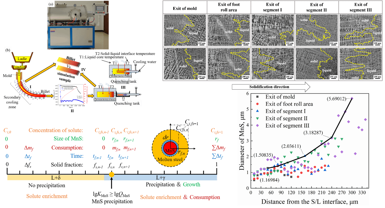 MnS是含硫低合金钢中常见的夹杂物,其尺寸和形貌对钢材的力学性能和加工性能具有显著影响。然而,传统研究方法通常只能获取铸态的MnS特征数据,难以捕捉其在连铸过程中的动态演化规律。为此,CAST团队创新性地利用自主研发的连铸坯枝晶生长热模拟装置,通过原位液淬功能在不同连铸工艺节点进行淬火,系统研究了MnS的析出与生长行为。该方法高度还原了连铸凝固过程,为研究MnS的动态演化提供了可靠的技术手段。