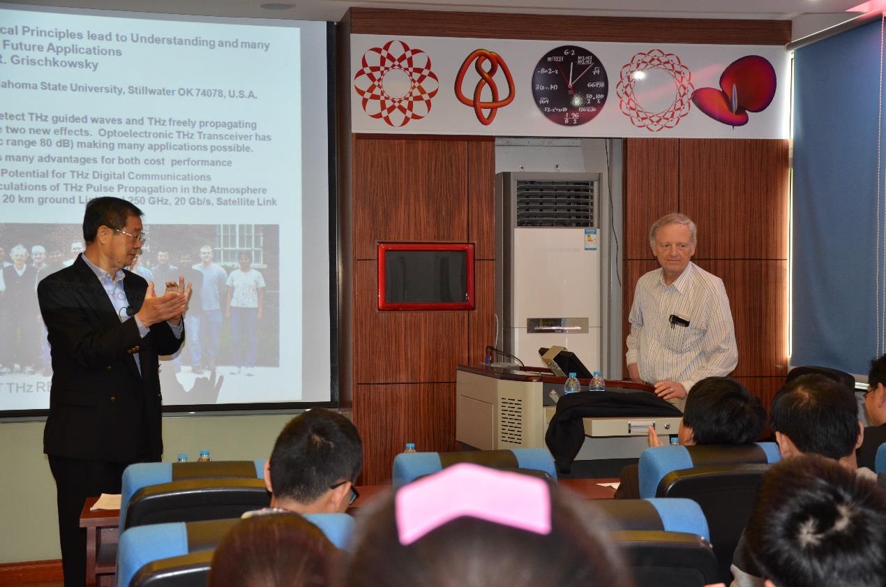 10月16日上午,在理学院院长沈学础院士主持下,Grischkowsky教授于G507报告厅做了题为“THz Photonics: The Synergy of Ultra-fast Lasers with Micro-Microwaves, Quasi-Optics, and Electronic Chips”的报告。报告上,他详细讲述了光电导天线产生和探测太赫兹波技术的发明过程,太赫兹技术的最新研究成果以及太赫兹技术的广阔应用前景。